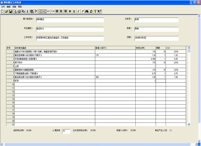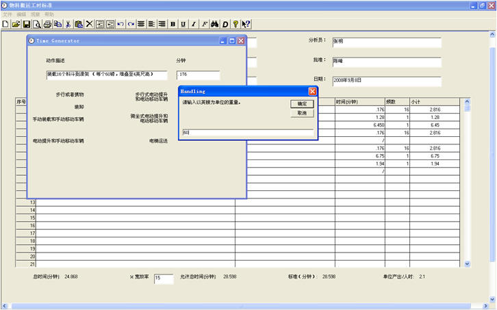 物料搬运是生产企业最常见到和最昂贵的工作之一,生产工人经常花费多达40%的时间在获取和放置物料上。本软件提供的工时标准工时系统,是在对物料搬运工作所可能涉及的各种操作和工具进行了充分分析和大量实测的基础上建立的,因而具有最齐全的物料搬运操作工时标准,可应用于各种各样的物料搬运工作测量。用户对物料搬运工作周期内所涉及的操作进行分类后,即可用本软件快速建立起相关的工时标准。本软件可即刻用于生产实践,或作为其他数据系统的补充,也可作为一个全新的物料搬运工时标准系统。本软件系统建立的标准工时涵盖了所有的走动、叉车、货车、升降机物料搬运及前后的必要操作。这些操作是所有工业或多或少都会用到的,所以应用十分广泛。涉及的物料包括铸件、金属片材、线材、导线、各种容器、桶、箱、托架、纸箱、袋等等。手推车、手动叉车用于运送较轻的物品到邻近区域,动力车则用于运送较重物品或用于远距离运输。