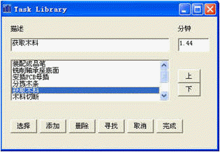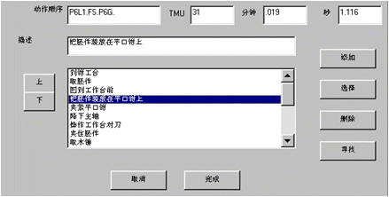 如果用户想在数据库中贮存或提取动作单元,可单击资料库按钮打开单元库窗口,如图4所示。这样用户可选择添加、删除、选择、和搜寻记录。该窗口的上和下按钮有助于用户重新排列各记录在数据列表中的位置。操作完成后单击完成按钮,程序将回到工时建立窗口,而从资料库中选择动作单元的内容将在TMUs、分钟、和秒文本框中显示出来。单击取消按钮可无操作退出该窗口。 |