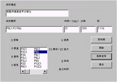 3. 工时建立窗口(如图3所示)打开后,用户可点击相关动作种类的标签以选择动作类型。这时对应的动作情形列表将显示出来。点击列表中的相关选项, 在TMUs、