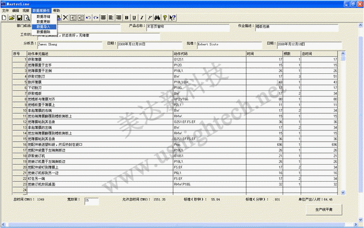 可从数据库导入工作测量档案,也可打开已存的工作测量文件,或者开始一个全新的工作测量分析。此窗口的各文本框、工作表的描述及频数栏目可输入相关的内容。工作表的动作代码、时间、