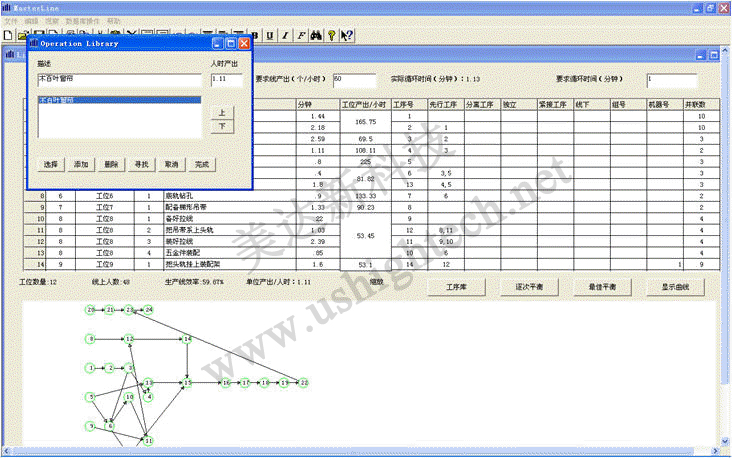 在工序资料库中,用户可以添加、删除、选择、以及寻找工序,所有操作只需按动几下鼠标即可完成。所选择的工序将自动在工位平衡窗口中显现。 |