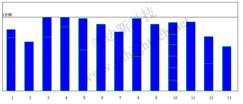 7. 生产线各工位的配置情况可以在平衡曲线窗口中用曲线表示出来,如图7-1和图7-2所示。该窗口有两个曲线图,一为生产线工位时间曲线,一为生产线工位生产能力曲线。用户可选择各种不同的二维或三维曲线类型表示平衡结果。此外,用户如对平衡的结果不甚满意,可手工对曲线中的工序单元进行移动、拷贝、删除、改变等操作,改动后的结果自动在工位平衡窗口中显示出来。 |